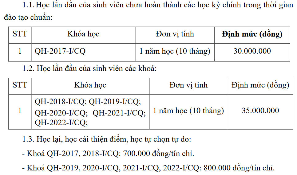 Cụ thể, học phí Trường Đại học Công nghệ - Đại học Quốc gia Hà Nội năm học 2022-2023 đối với các chương trình đào tạo chuẩn, chất lượng cao có mức học phí cao nhất là 715.000 đồng/tín chỉ, cao hơn mức cũ 315.000 đồng là 2,26 lần.