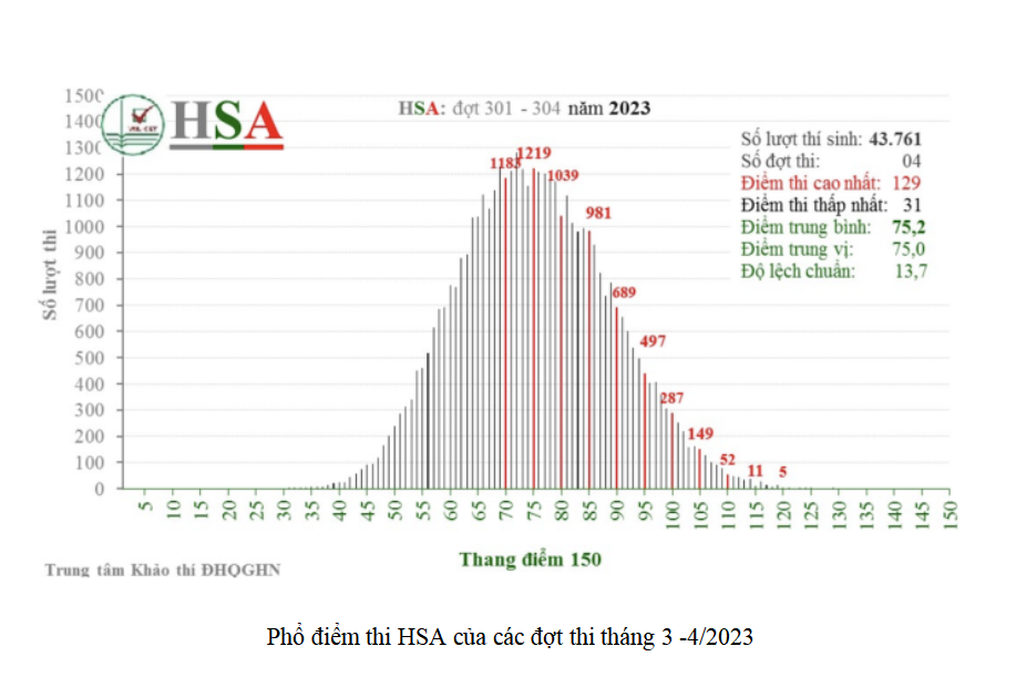 | Trước đó, Trung tâm Khảo thí ĐH Quốc gia Hà Nội đã công bố phổ điểm thi của 4 đợt đầu tiên theo phân bổ chuẩn, điểm trung bình của các thí sinh đạt 75,2/150 (giảm 2,4 điểm so với cùng kỳ năm 2022). Thí sinh đạt điểm cao nhất là 129/150, thấp nhất là 31/150. Phổ điểm ổn định theo từng đợt thi, số thí sinh đạt từ 100 điểm trở lên chiếm 4,4%. |