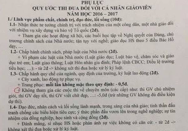 "Không tham gia các cuộc thi về chuyên môn như thi giáo viên chủ nhiệm giỏi,  thi giáo viên dạy tốt, thi giáo viên viết chữ đẹp… trừ 5 điểm”.