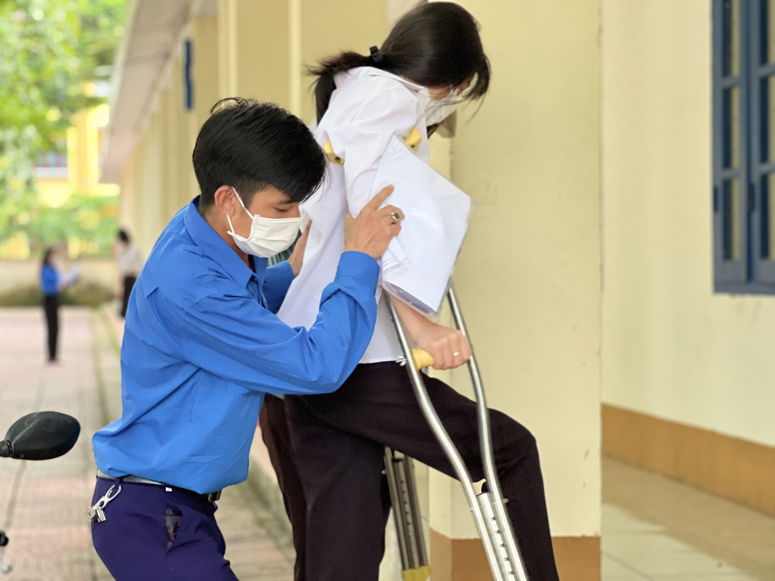 Trong ngày đầu của kỳ thi tốt nghiệp THPT năm 2022, tại Quảng Ninh có nhiều thí sinh đang phải điều trị ở bệnh viện hoặc ở nhà do bị tai nạn. Đa số phải ngồi xe lăn, chống nạng và được người thân đưa tới điểm thi. Khi tới cổng trường đều được đội ngũ tình nguyện viên cùng thầy cô hỗ trợ tận tình để di chuyển tới phòng thi.