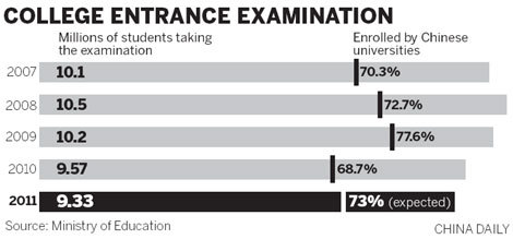 học, so với số liệu của năm 2010 là 77.6% của 9.57 triệu thí sinh. Như vậy tỉ lệ
