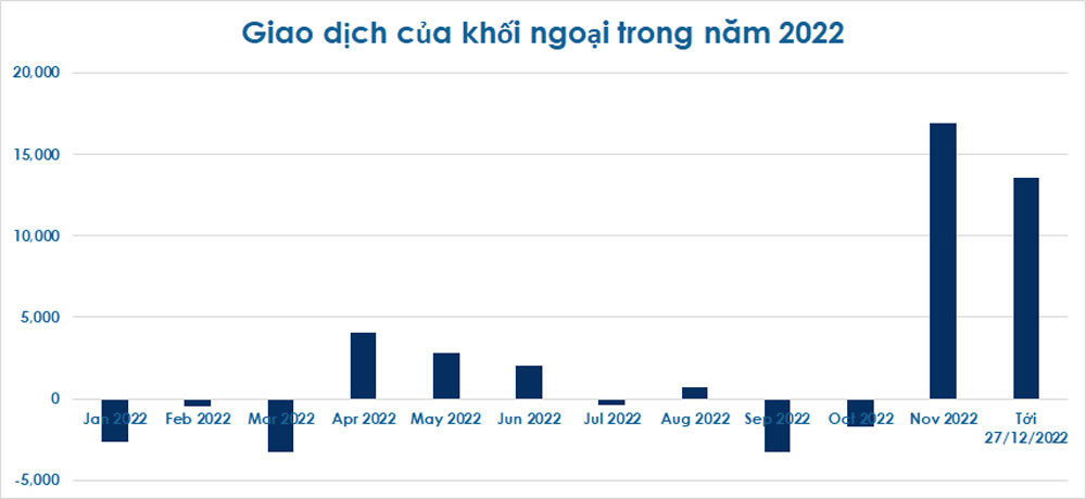 Trái với đà bán mạnh của các nhà đầu tư trong nước khiến VN-Index có lúc giảm xuống 873 điểm hôm 6/11, các nhà đầu tư nước ngoài mua ròng mạnh trong hai tháng 11 và 12, tổng lên tới hơn 29 nghìn tỷ đồng. Lũy kế cả năm 2022, khối ngoại mua ròng khoảng 27 nghìn tỷ đồng.