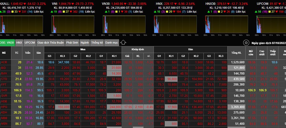 Trong phiên sáng 7/10, tất cả các cổ phiếu trụ cột giảm giá. Nhóm ngân hàng và bất động sản đồng loạt giảm mạnh trong bối cảnh thanh khoản trên hệ thống ngân hàng tụt giảm nghiêm trọng.