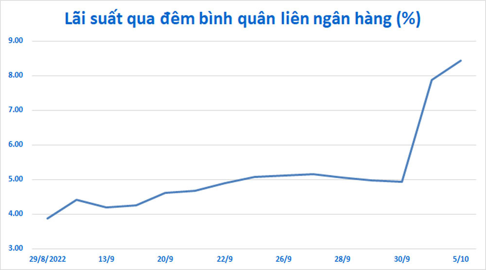 Lãi suất qua đêm trên thị trường liên ngân hàng hôm 5/10 đã lên tới 8,44%/năm, trong khi cho kỳ hạn 9 tháng lên tới 9,72%. Lãi suất huy động của các ngân hàng nhiều nơi lên ngưỡng 8-9%/năm.