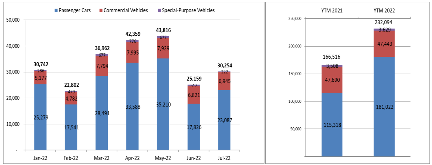 Trong số 30.254 xe bán ra của tháng 7/2022, xe lắp ráp trong nước đạt 13.759 xe, tăng 25% so với tháng trước và doanh số xe nhập khẩu nguyên chiếc là 16.495 xe, tăng 17% so với tháng trước.