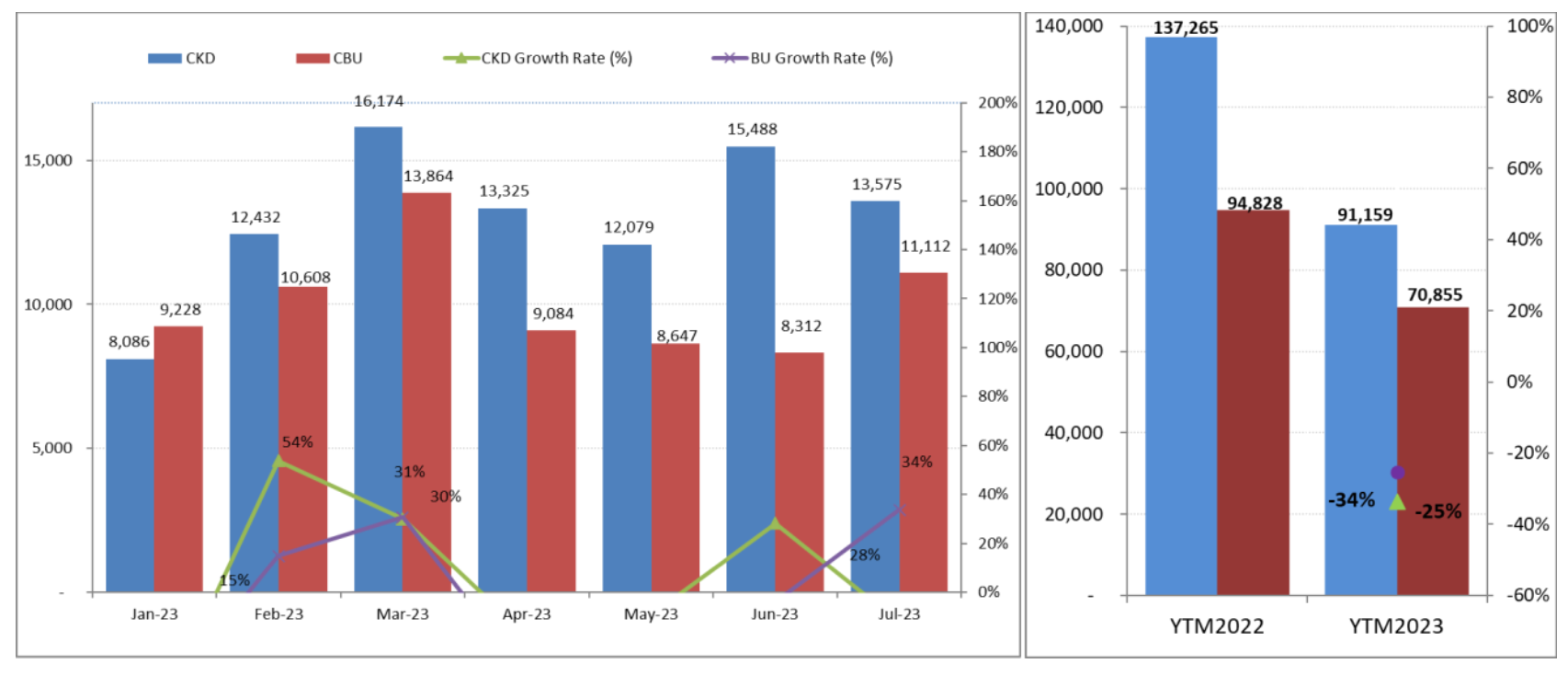 Trong tổng số 24.687 xe đã bán được trong tháng 7 theo báo cáo VAMA, doanh số của xe lắp ráp trong nước đạt 13.575 xe (giảm 12% so với tháng trước) và xe nhập khẩu nguyên chiếc là 11.112 xe (tăng 34%).