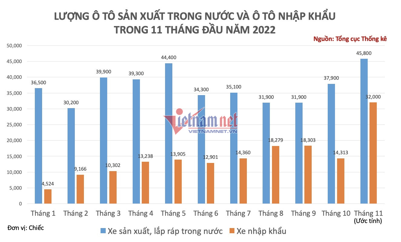 Cũng theo báo cáo của Tổng cục Thống kê, trong tháng 11/2022, ước tính có 32.000 chiếc ô tô nguyên chiếc được nhập về Việt Nam với tổng giá trị kim ngạch ước đạt 616 triệu USD. Lượng xe nhập khẩu cũng tăng hơn gấp đôi so với tháng trước cả về số lượng và giá trị.