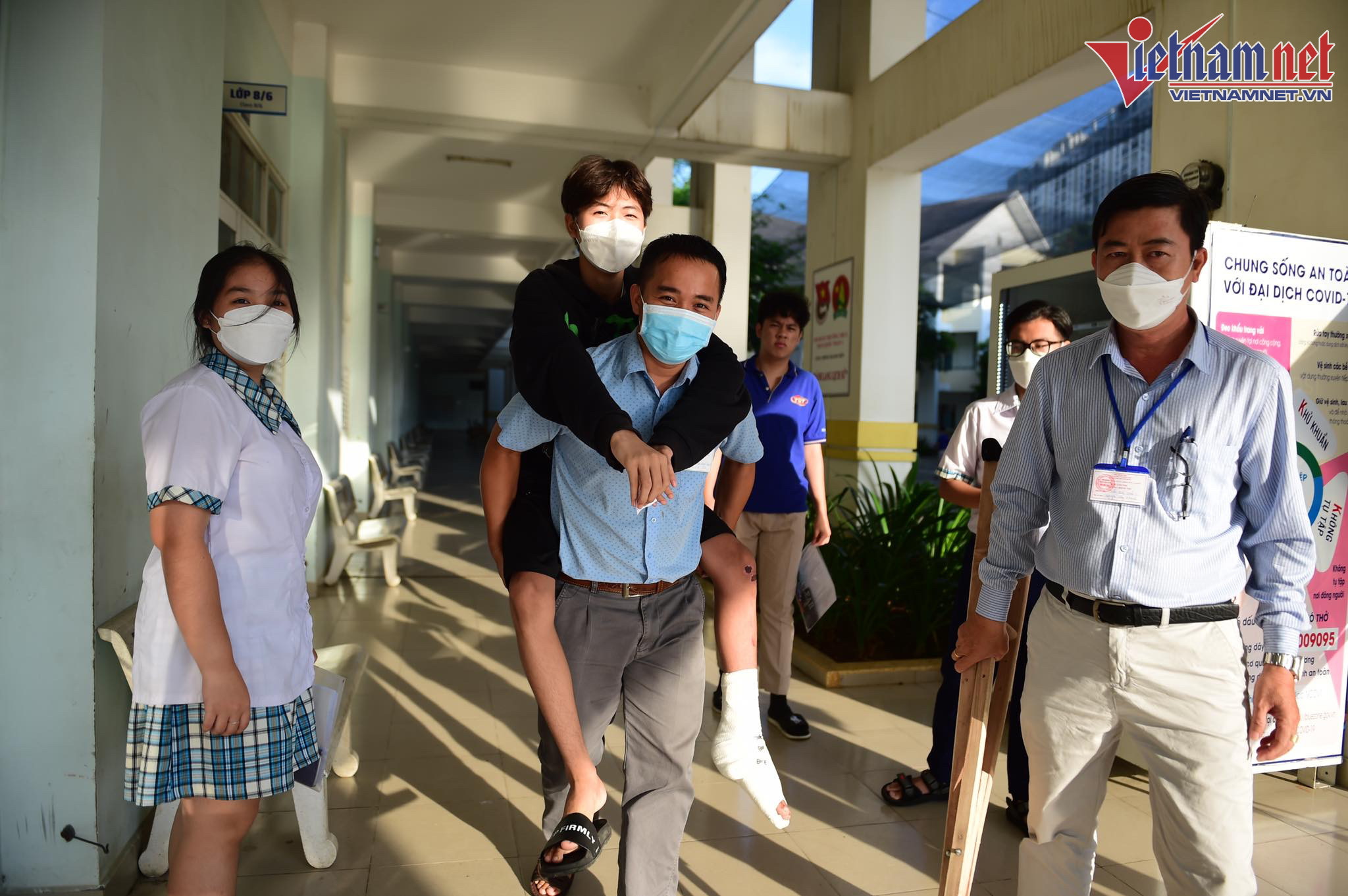Sáng nay, tại điểm thi Trường THCS Trần Quốc Toản, thí sinh Bùi Quốc Khánh gãy chân do bị tai nạn được thầy Nguyễn Văn Tân cõng lên phòng thi.