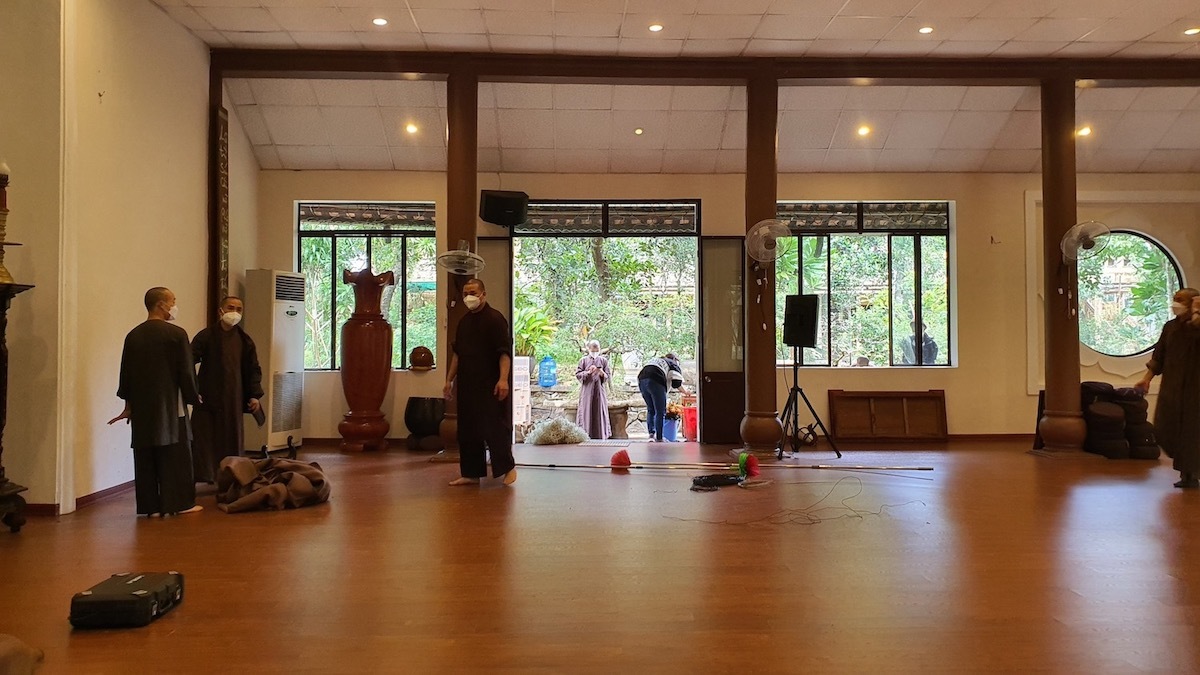 | Bên trong chùa, các Phật tử đang sửa soạn để chuẩn bị tang lễ cho Thiền sư. |