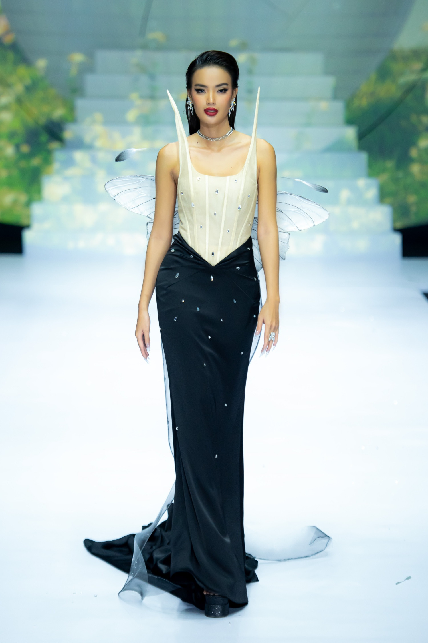 Nguyễn Thanh Thanh (bên trái) và Hoàng Thị Nhung hoá nàng tiên, lần lượt đảm nhận vị trí mở màn và vedette của BST 'Flutters' trong chiếc đầm dạng corset với đôi cánh là điểm nhấn, phối cùng vòng cổ và hoa tai bạc lấp lánh.