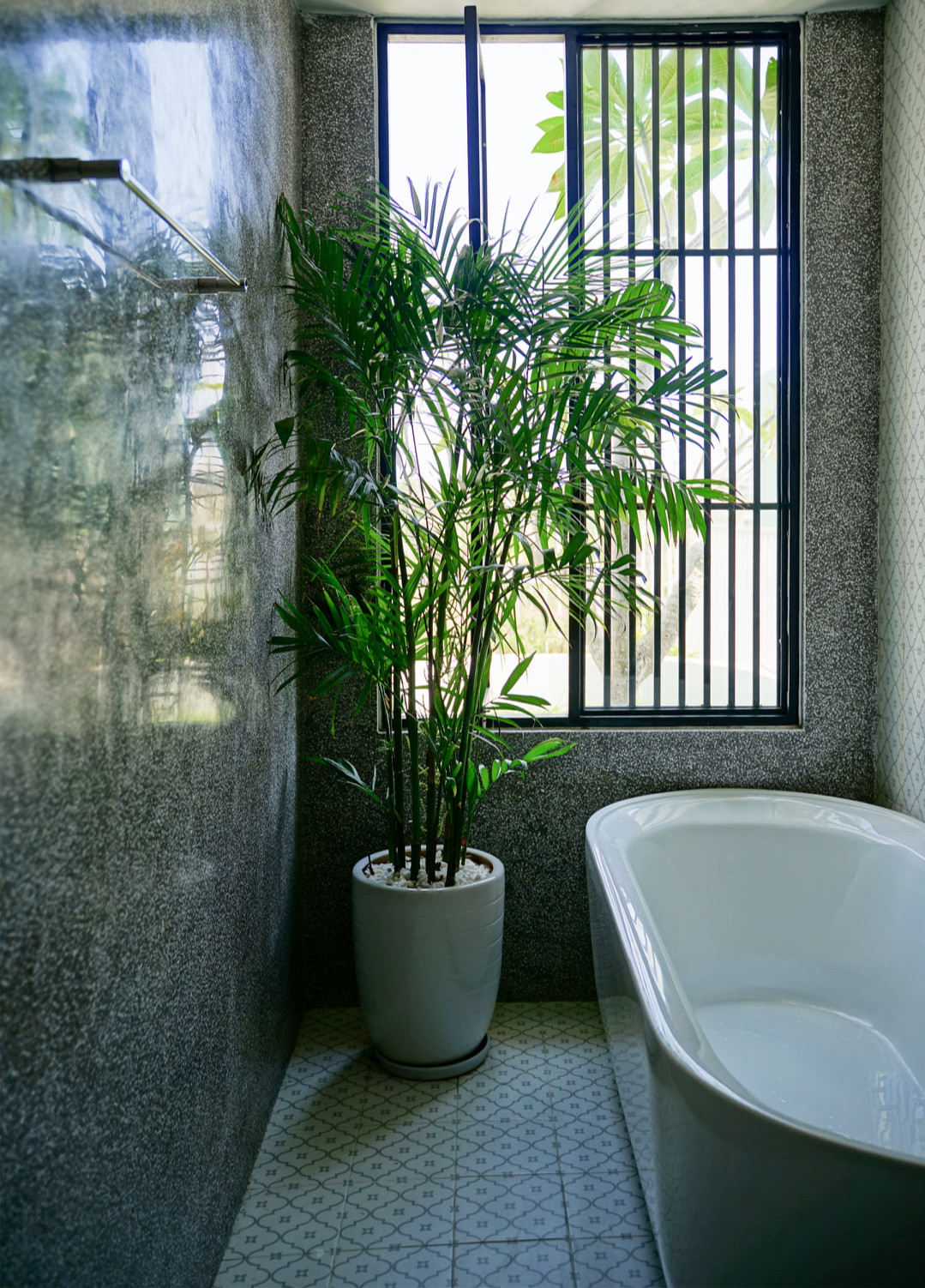 Phòng tắm được sử dụng đá mài và gạch ốp lát để phù hợp với đặc tính khô - ướt của mỗi khu vực, mang đến vẻ hiện đại, tinh tế.