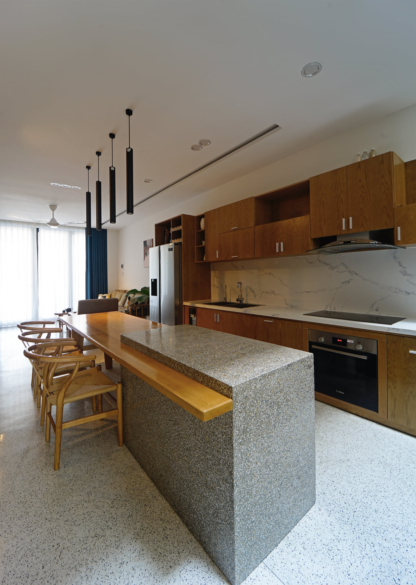Về không gian nội thất, gỗ được sử dụng làm vật liệu chính cho căn nhà tạo cảm giác ấm cúng, kết hợp vật liệu đá mang màu sắc trung tính xung quanh khoảng thông tầng góp phần giảm thiểu đáng kể bức xạ nhiệt và điều tiết nhiệt độ bên trong ngôi nhà.