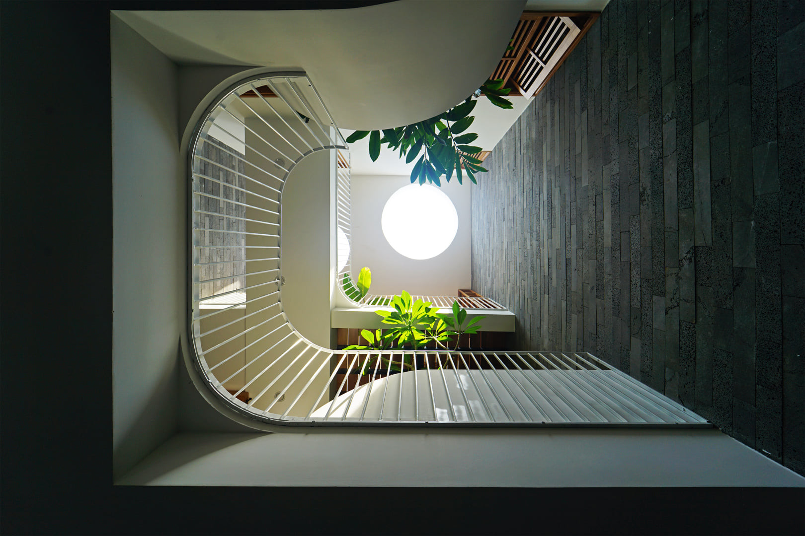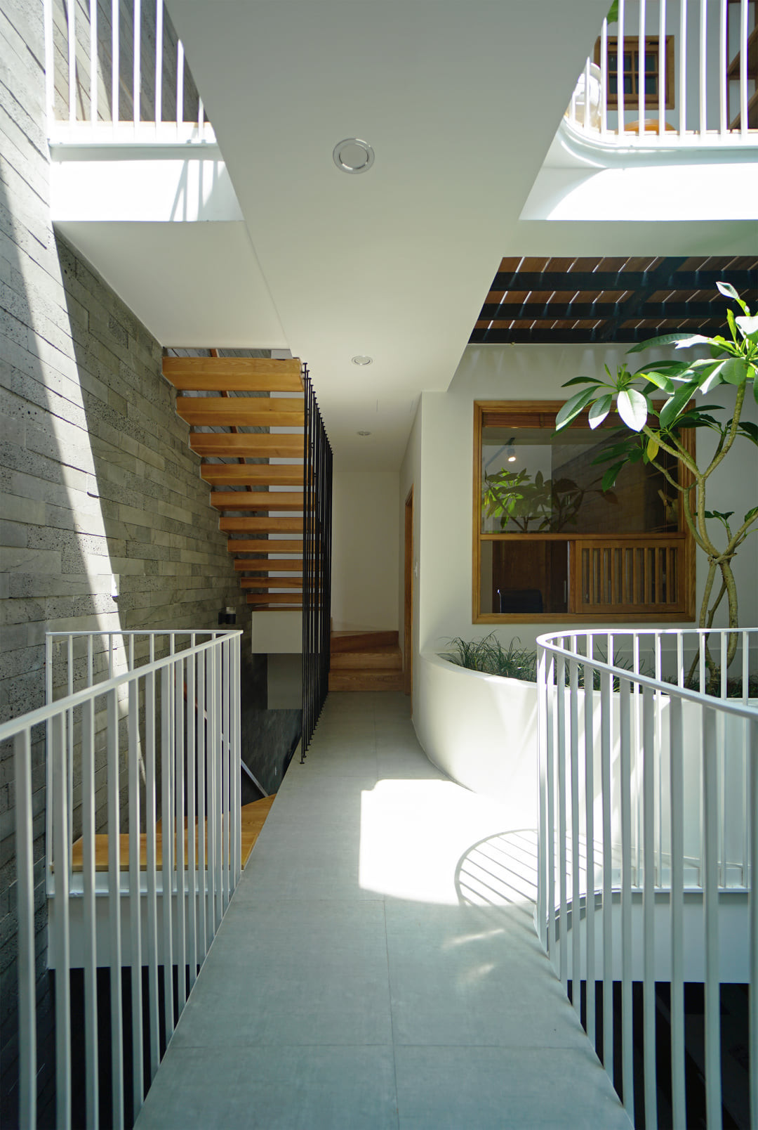Với cách bố trí không gian chung ở tầng 1 cùng những khoảng sân vườn, các kiến trúc sư muốn thúc đẩy việc giao tiếp và kết nối giữa các thành viên trong nhà. Tại những khoảng thông tầng, con người có thể tương tác với các không gian còn lại, từ đó khích lệ các hoạt động chung của cả gia đình.