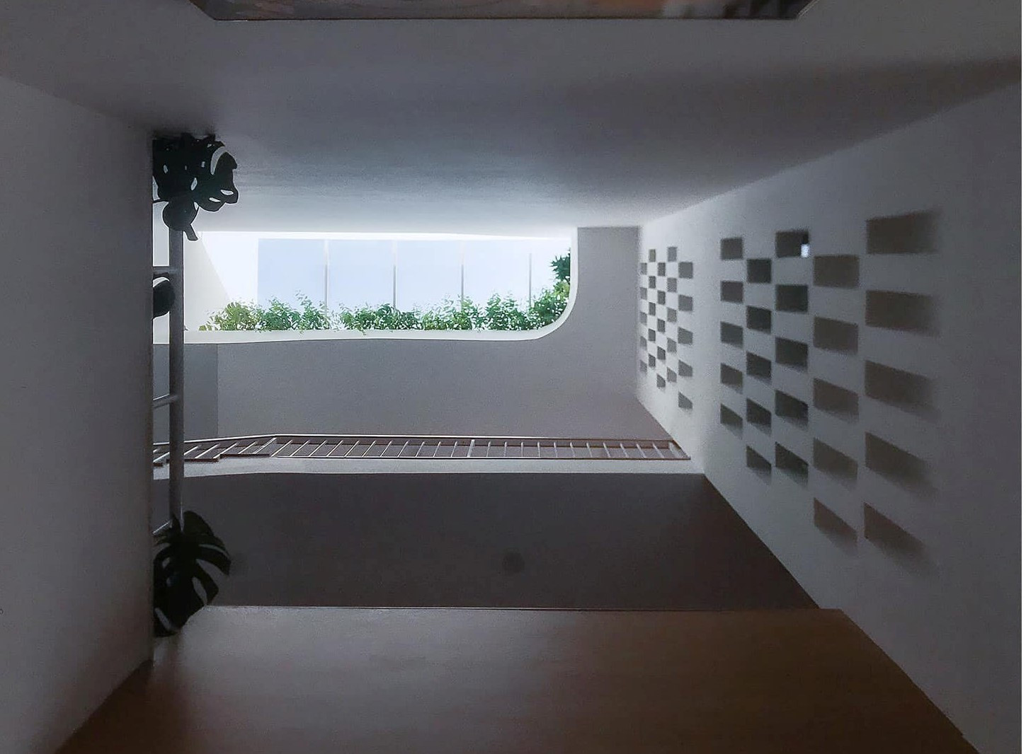 Nắng chiếu xuống giếng trời, tạo thành vệt đẹp mắt.
