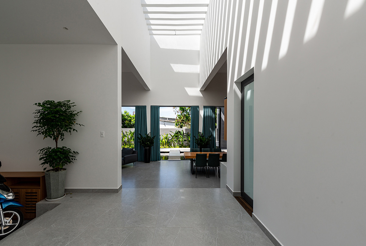 Nhà được thiết kế với lối giao thông tiện lợi, dễ dàng quan sát. Chủ nhà vừa vào khu vực để xe máy là sảnh trung tâm của ngôi nhà. Tại đây, gia chủ có thể quan sát, kiểm soát và có thể di chuyển tới các không gian khác.