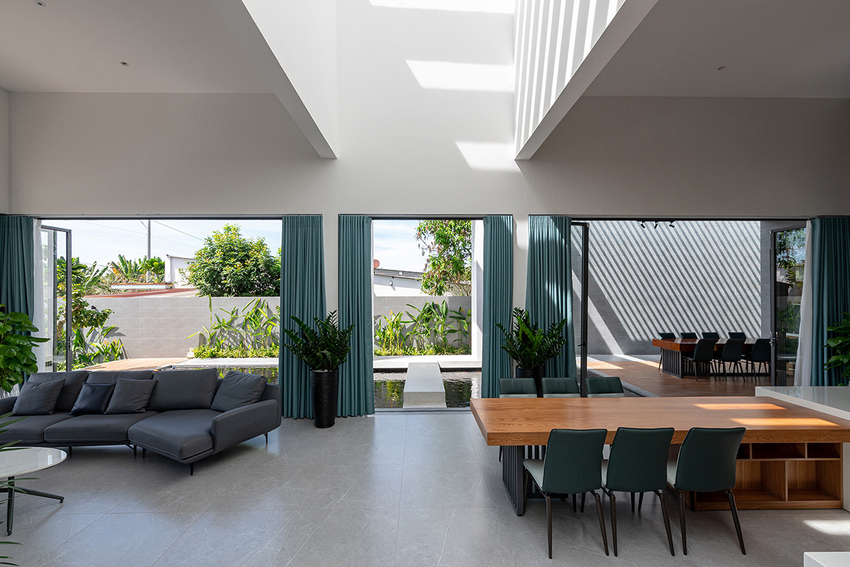 Giếng trời nằm tại vị trí sảnh trung tâm giúp lấy ánh sáng tự nhiên tạo cảm giác nhẹ nhàng, thoải mái. Đồng thời tạo nên một tấm ngăn vô hình giữa bếp và khách.
