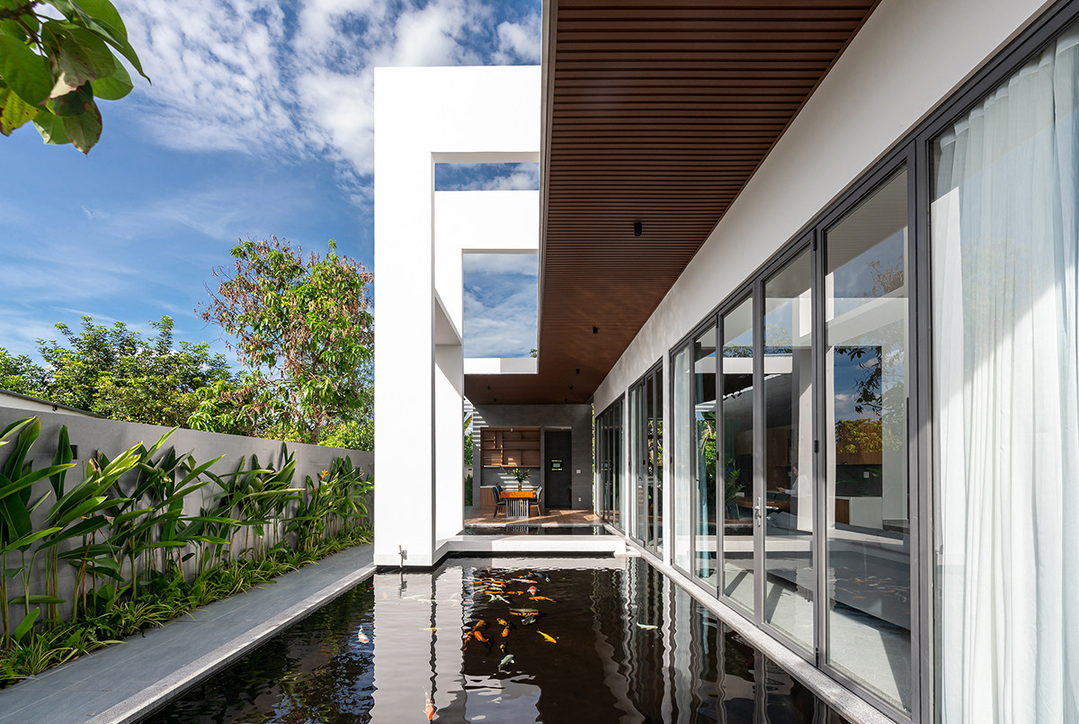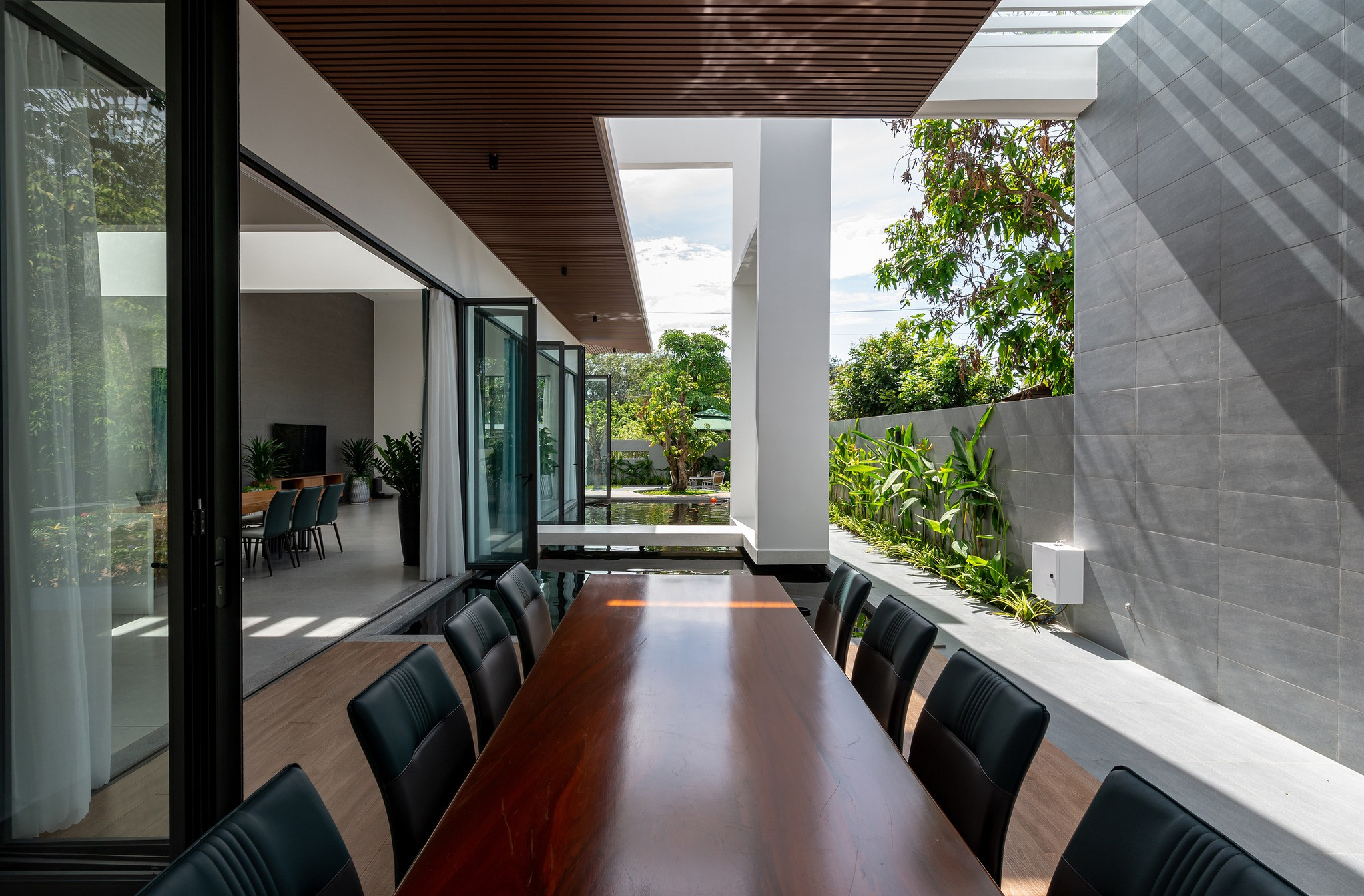 Không gian phòng ngủ, phòng khách, bếp ăn đều mở ra khoảng sân vườn với mảng kính lớn kết nối với thiên nhiên giúp chủ nhà không cảm thấy đơn độc.
