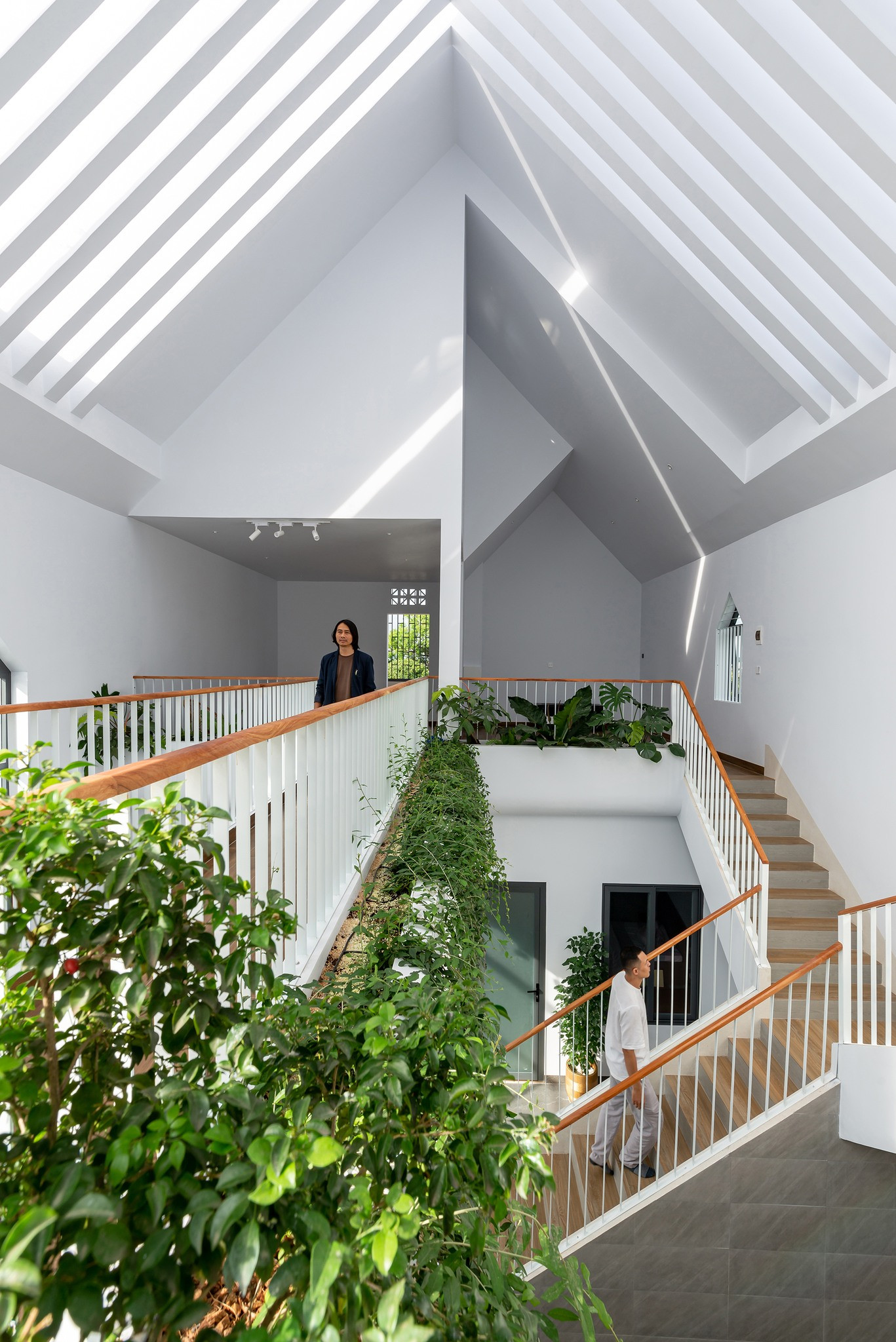 Phần mái dốc dùng chất liệu trong mờ lấy sáng cho toàn bộ không gian nhà nhưng vẫn đảm bảo tránh mưa ướt. Phía dưới là hệ thống cây xanh lọc không khí, lọc bụi và chống nóng. Những khung cửa kính lớn tăng cường sự đối lưu gió và thông thoáng xuyên suốt.