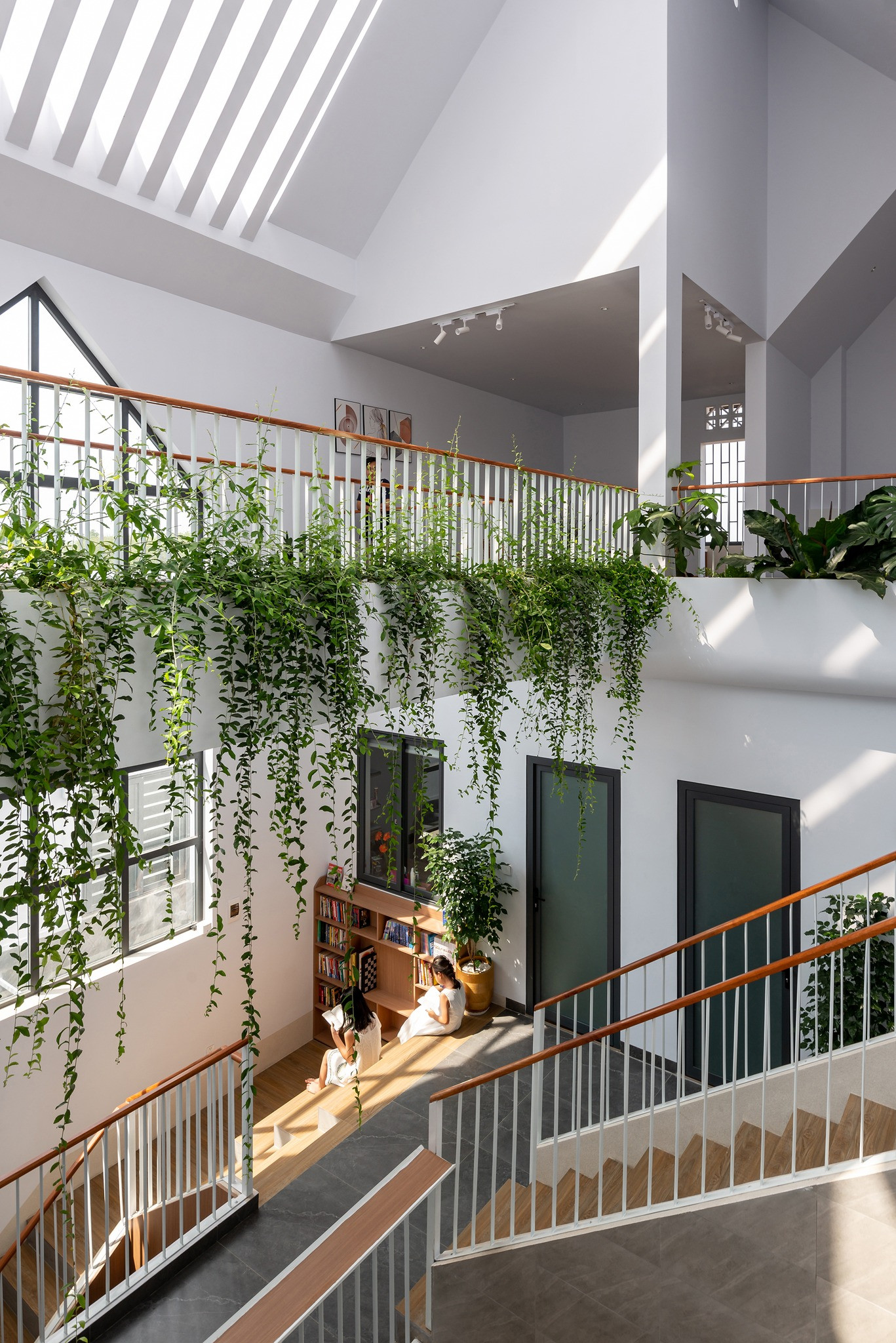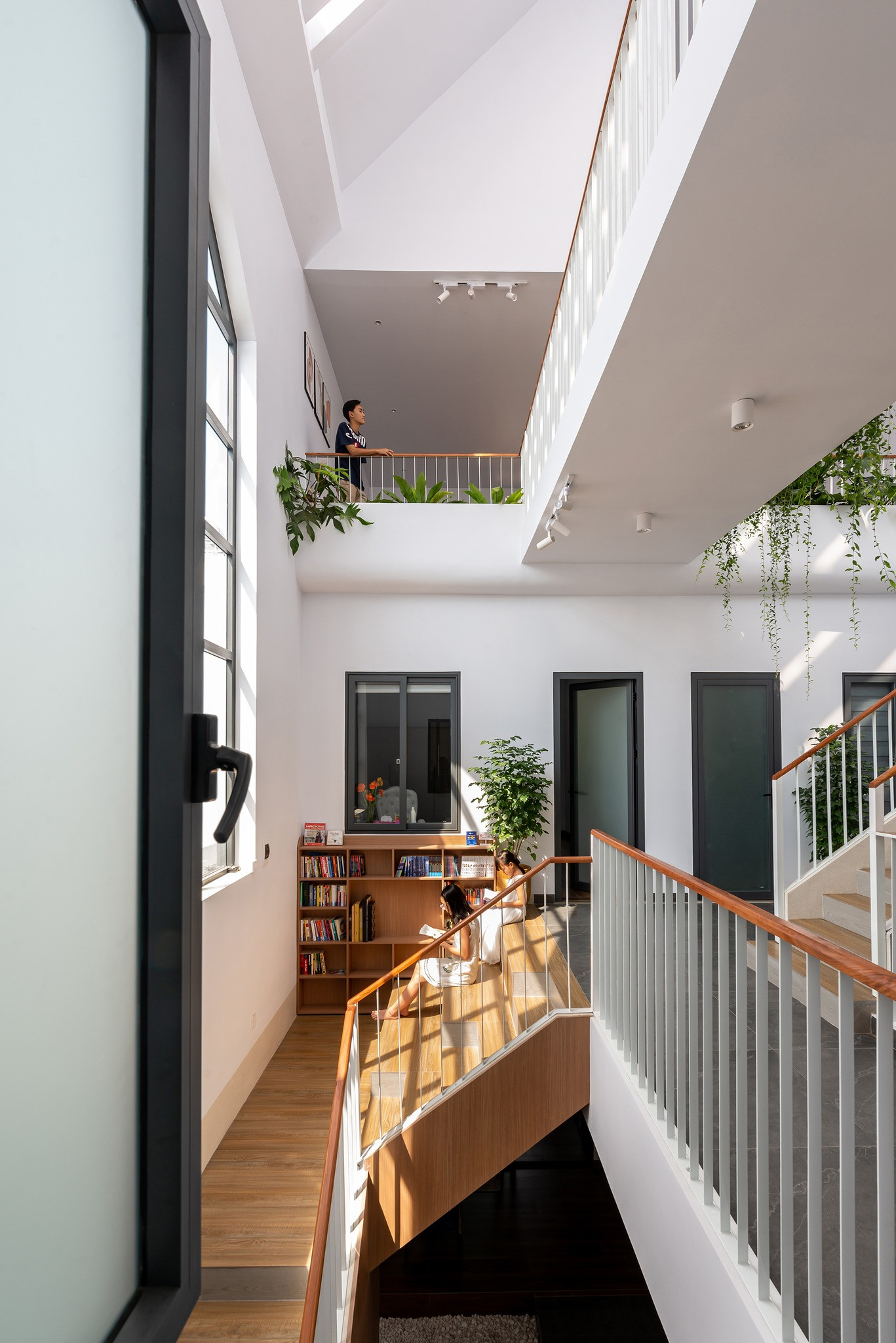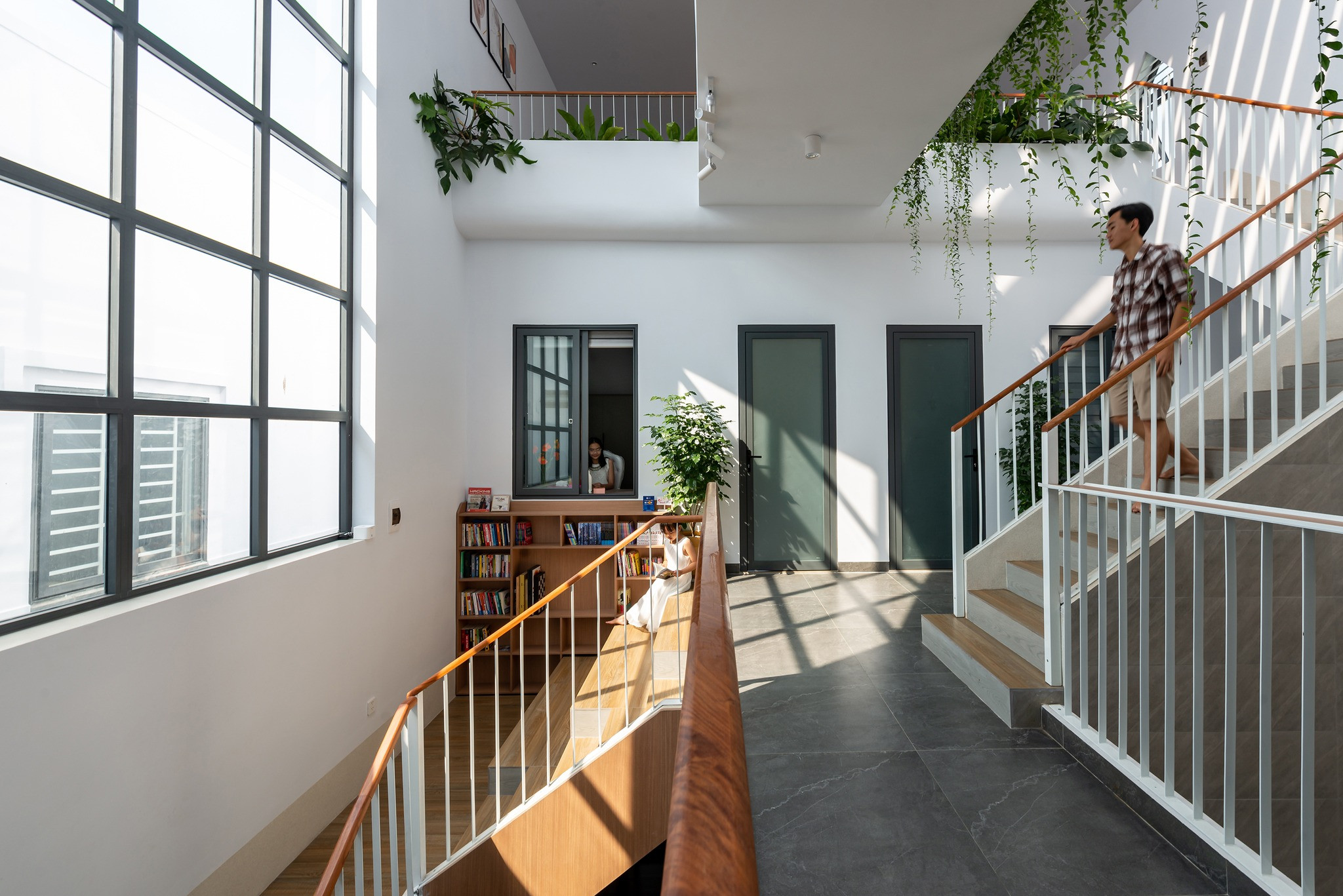 Bậc cầu thang tiếp nối giữa các tầng so le tạo thành góc đọc sách, đón nắng chill cho cả nhà. Vì nhà có nhiều ánh sáng tự nhiên nên ban ngày hoàn toàn không cần dùng đến đèn điện, nên kiến trúc sư chỉ lắp đèn led ống bơ, tạo ánh sáng vàng nhạt, ấm áp cho buổi tối.