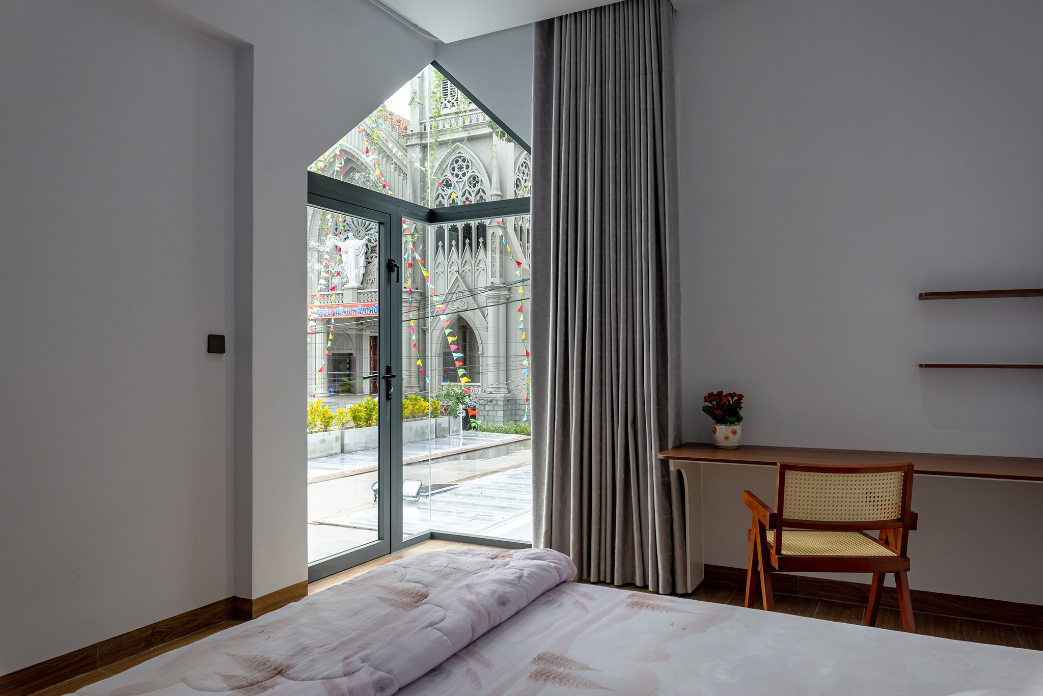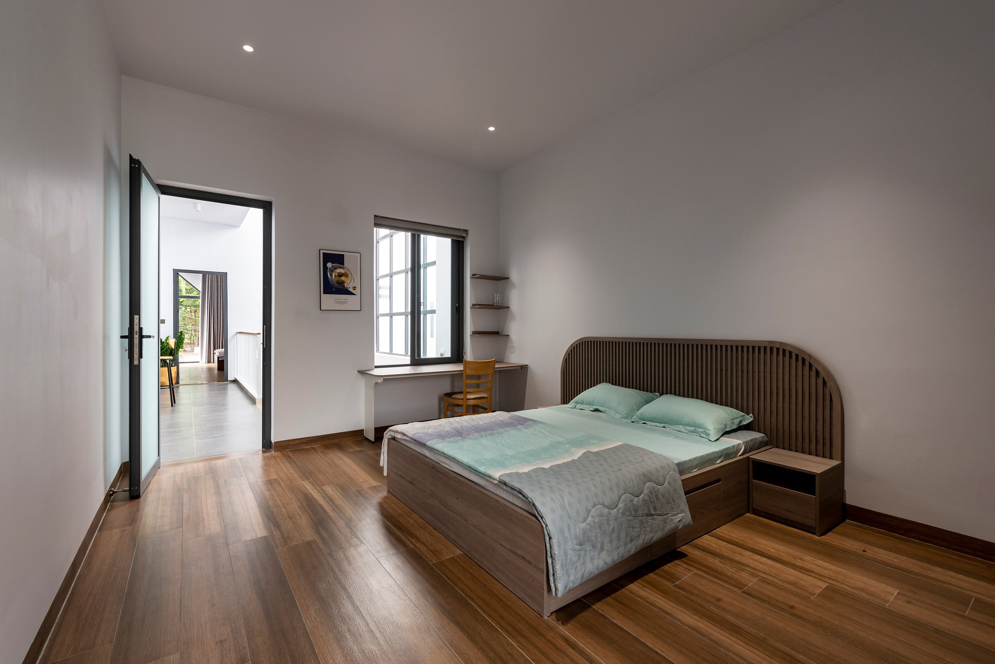 Gần cửa đi vào nhà, kiến trúc sư đặt chậu cây nhỏ và chiếc ghế bập bênh để làm nơi thư giãn. Phía sau là bàn làm việc và vườn nhỏ luân chuyển ánh sáng, gió mát.