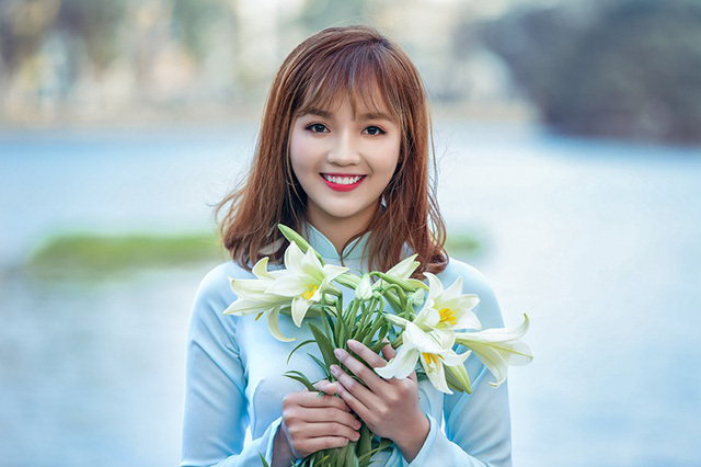 Hai thiếu nữ Mai Hương và Dương Nhi khoe sắc rạng ngời bên hoa loa kèn - loài hoa tháng Tư của Hà Nội.
