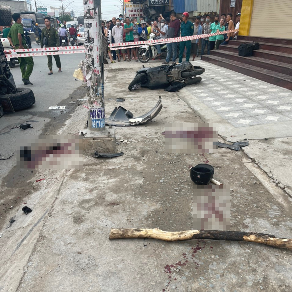 Ghi nhận tại hiện trường, ô tô 7 chỗ lật nghiêng giữa đường. Xe máy bị tông văng trên vỉa hè, hư hỏng nặng.