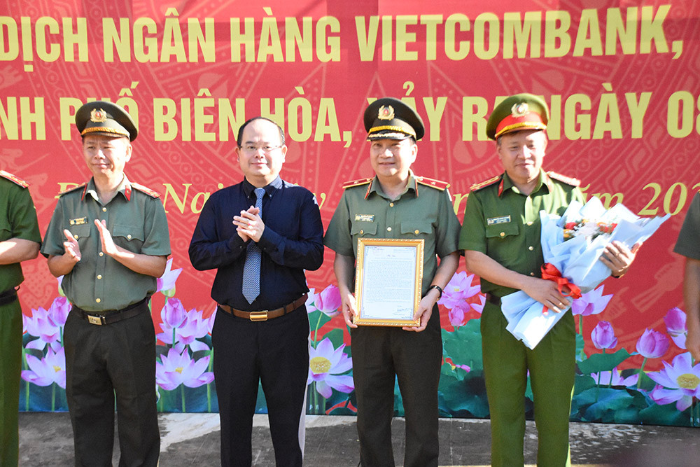 Theo đó, Phó Bí thư Quản Minh Cường đã trao thư khen của Bí thư Tỉnh uỷ cho tập thể Công an tỉnh Đồng Nai vì thành tích xuất sắc trong việc bắt giữ nghi can vụ cướp ngân hàng Vietcombank - Phòng giao dịch Tam Phước, TP.Biên Hoà xảy ra vào ngày 8/9.