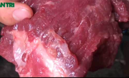 Thịt bò sau khi giết thịt từ hàng tháng, thậm chí hàng năm đã ôi thiu, được một số tiểu thương bóp với hóa chất trắng mịn, sau đó bôi máu lên làm tươi và bán cho người tiêu dùng.