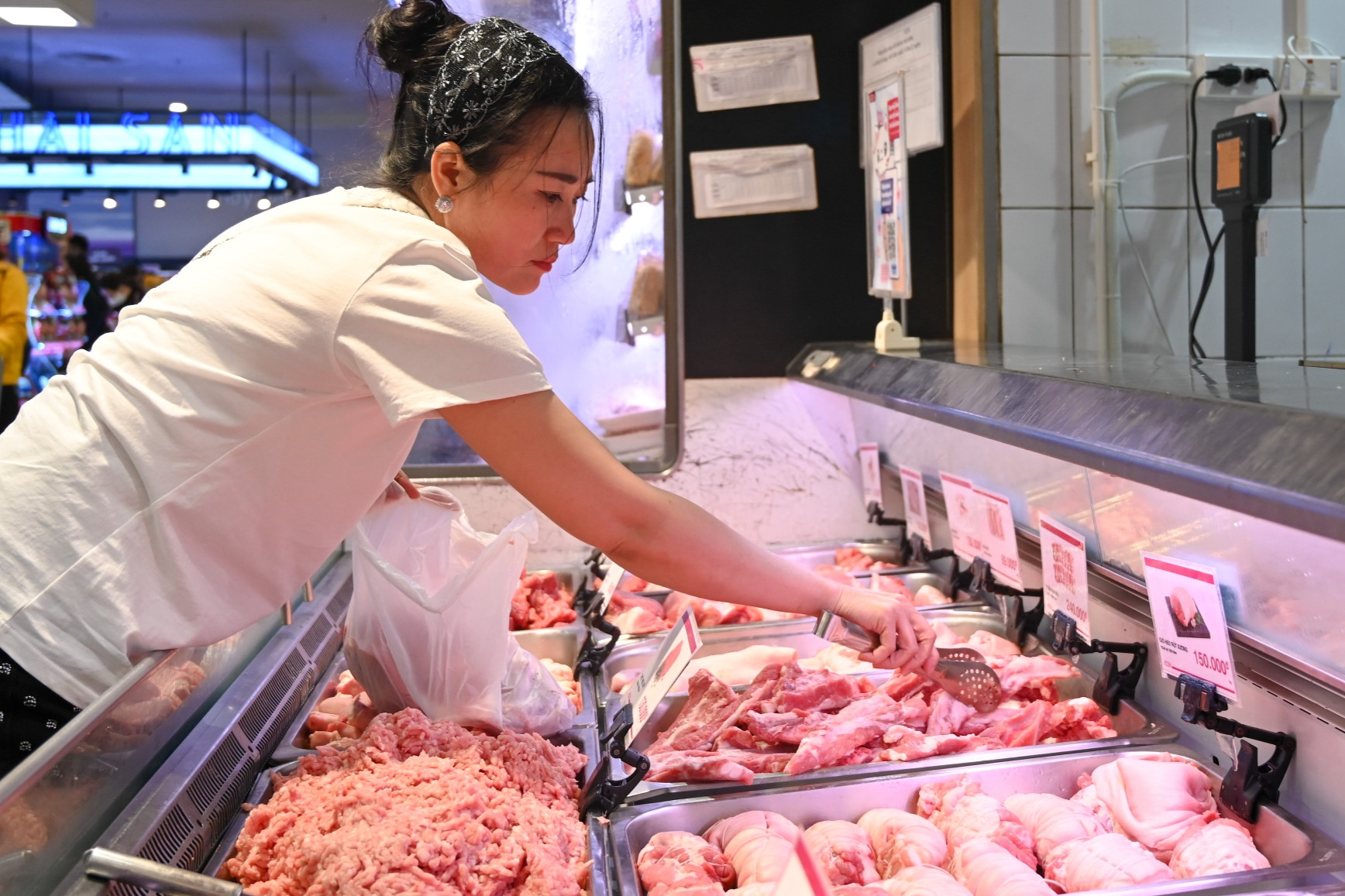 Dịp này, công việc bận rộn, thịt trong tủ cấp đông cũng hết. Chị xuống cửa hàng tiện lợi ngay dưới khu chung cư mình ở để mua vài loại đủ ăn đến hết tuần. Lướt qua xem giá thịt lợn tại đây, chị cảm thấy choáng váng vì loại nào cũng đắt đỏ. Ba chỉ rút sườn giá 280.000 đồng/kg, sườn non lên tới 300.000 đồng/kg, hay thịt xay giá cũng 150.000 đồng/kg.