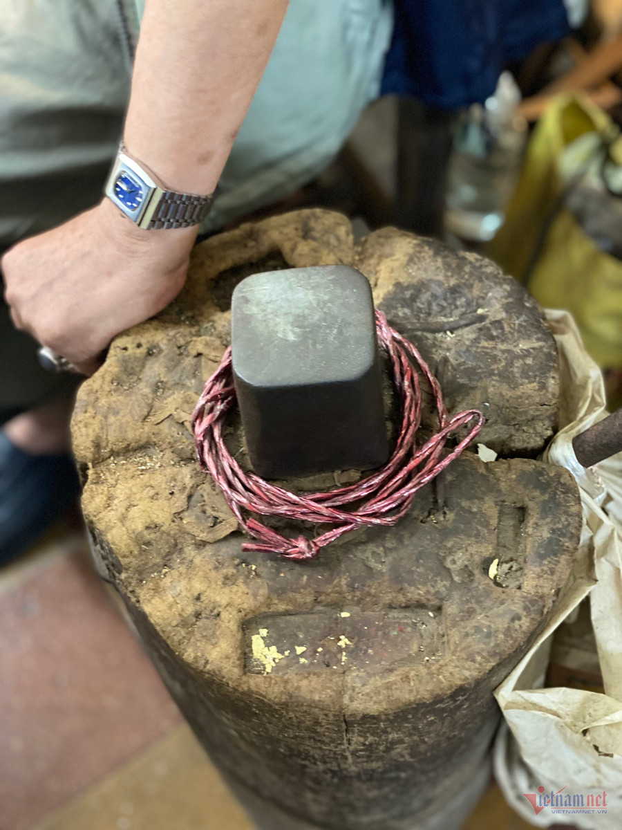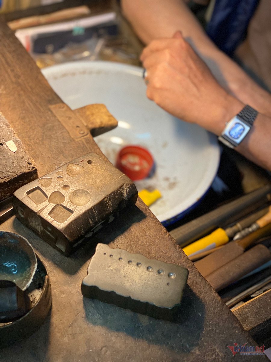 Ông cười kể: “Tôi quý những dụng cụ này như sinh mạng của mình, cũ cũng không vứt bỏ. Ngay cả mẩu gỗ nhỏ, nếu hỏng, chúng tôi sẽ mang đi đốt chứ không vứt vào thùng rác. Trước đây, gia đình tôi từng đốt một mẩu gỗ làm đế đe cũ. Sau đó tôi mang tro đi đãi, lọc ra được gần chỉ vàng. Bởi lúc làm, bụi vàng rơi xuống dưới, bám vào đế đe. Nhiều năm tích tụ lại cũng được ngần ấy”.