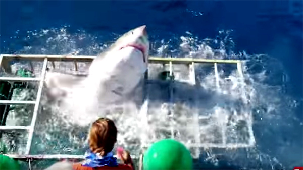 Một clip kinh hoàng ghi lại cảnh con cá mập trắng khổng lồ bất ngờ lọt vào lồng của thợ lặn dưới biển.