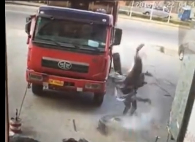 Đang sửa chiếc lốp xe tải rất to bất ngờ lốp xe phát nổ khiến người thợ văng lên cao rồi rơi xuống.