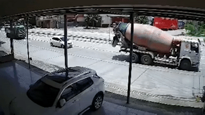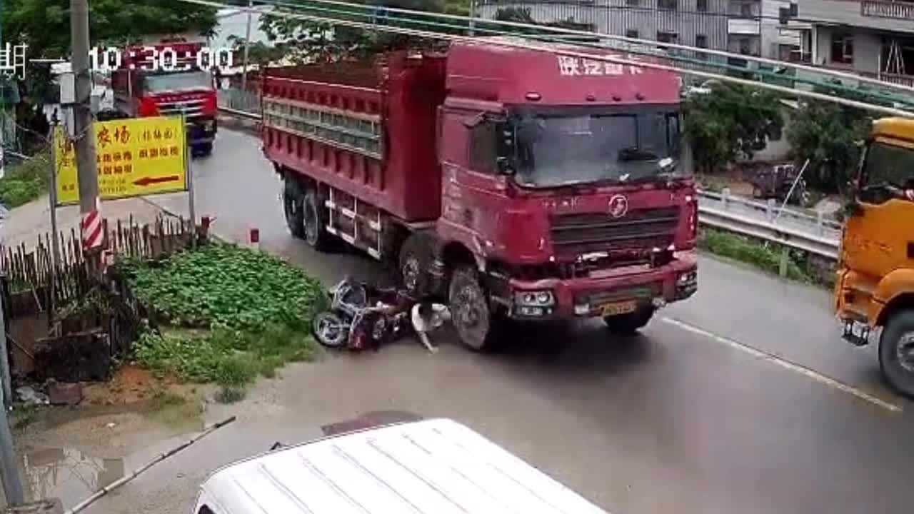 Nhờ nhanh chân nhảy khỏi xe máy trước khi bị xe tải đè, tài xế xe máy đã may mắn thoát chết.