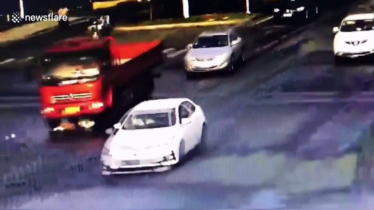 Một cô gái đi xe đạp ở Trung Quốc bị xe tải đâm đã thoát chết một cách thần kỳ nhờ 'tuyệt kỹ' cuộn tròn người như một quả bóng.