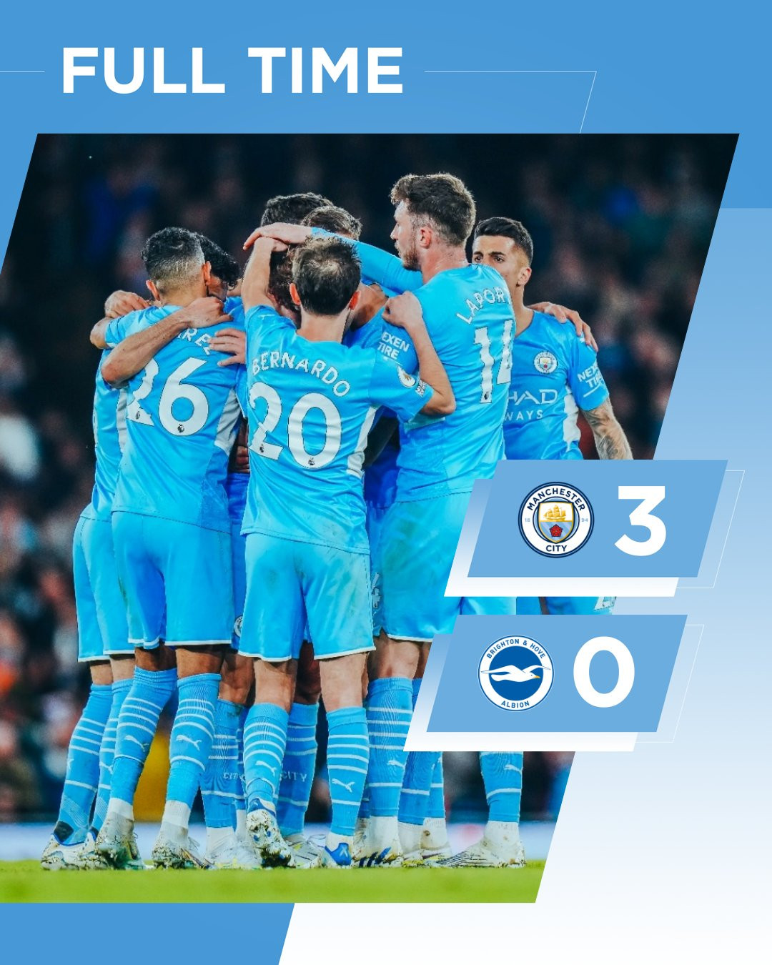 Man City áp đảo ngay sau tiếng còi khai cuộcHọ liên tục bắn phá khung thành thủ môn SanchezHàng thủ Brighton phòng ngự kiên cườngThi thoảng đội khách cũng tổ chức phản công lợi hạiMãi sang hiệp hai, Mahrez lẻn xuống mở tỷ số cho Man CityFoden nhân đôi cách biệt với pha lập công may mắnBernardo Silva ấn định chiến thắng 3-0 cho Man "xanh"Kết quả giúp đoàn quân HLV Guardiola trở lại ngôi đầu bảng