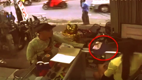 Đoạn clip từ camera an ninh cho thấy, tên trộm đã dùng chiêu trò bán vé số để 'thôi miên' trộm iPhone 6 ngay trước mắt chủ cửa hàng.