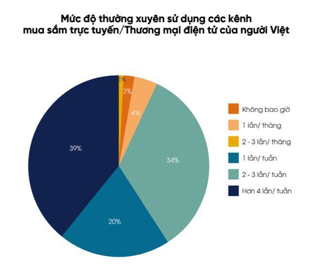 Sau khi dịch bùng phát năm 2020, 93% người tham gia khảo sát cho biết mua sắm trên mạng đều đặn ít nhất một lần mỗi tuần. Số người thường xuyên mua sắm (hơn 4 lần/tuần) chiếm đến 39%. Trong đó, 58% người nói thường mua sắm trên thương mại điện tử hơn sau ảnh hưởng của đại dịch.