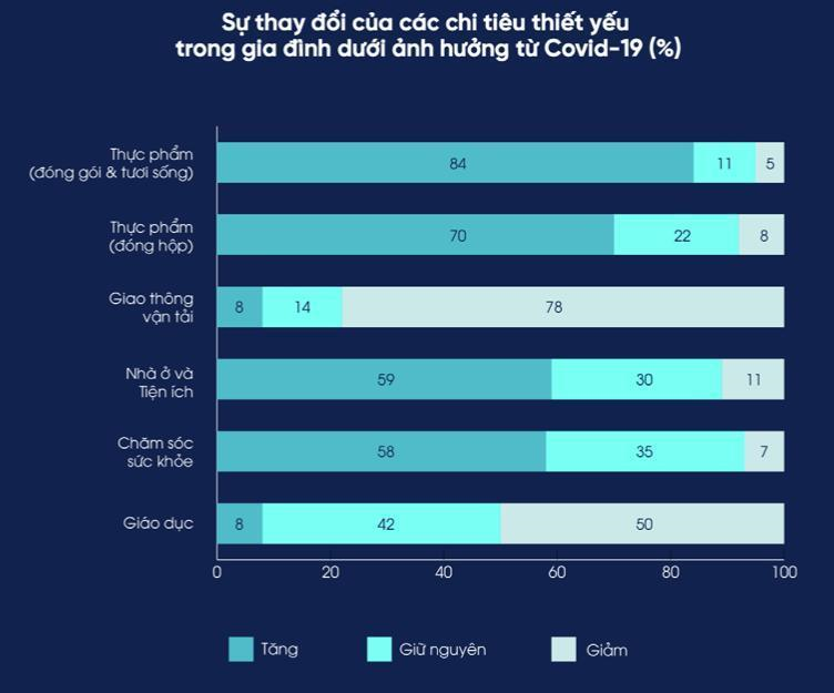 Dịch bệnh cũng ảnh hưởng xu hướng mua sắm của người dùng. Chẳng hạn, phần lớn (84%) gia tăng mua các mặt hàng thực phẩm tươi sống, hơn một nửa tập trung mua sản phẩm chăm sóc sức khoẻ và nhà ở. Rất nhiều người giảm mua sản phẩm liên quan đến giao thông vận tải và giáo dục.