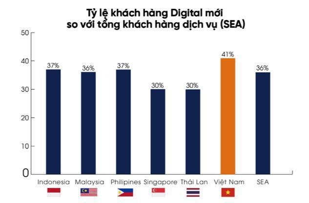 Trong các quốc gia Đông Nam Á, Việt Nam dẫn đầu về tỷ lệ khách hàng kỹ thuật số mới so với tổng khách hàng ở ngành dịch vụ. Trong đó, tỷ lệ khách kỹ thuật số này sẽ quay lại dùng dịch vụ ít nhất một lần sau Covid-19 rất cao, 94%, thuộc top cao trong khu vực.