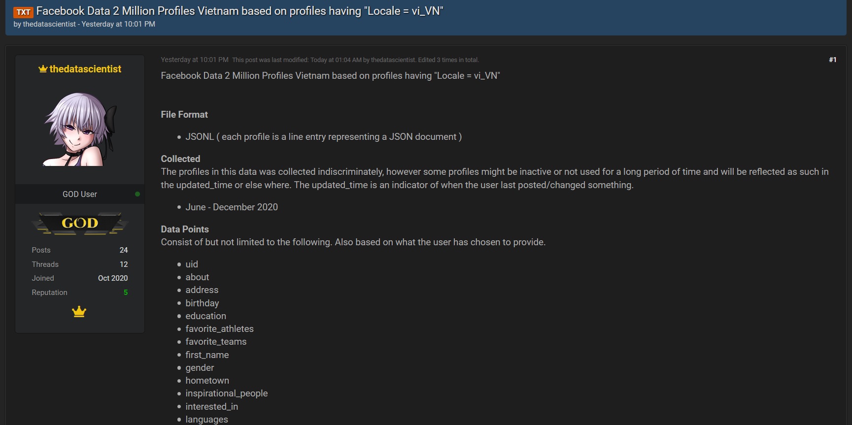 Trong một bài đăng trên diễn đàn R*forums vào giữa tháng 11 vừa qua, một tài khoản có tên "Itianyi" đã đăng tải một cơ sở dữ liệu mà người này khẳng định chứa thông tin của hơn một triệu tài khoản người dùng Facebook tại Việt Nam, bao gồm đầy đủ các thông tin từ mã số tài khoản, tên sử dụng, họ tên, giới tính, công việc, sở thích, quê quán, số điện thoại, tình trạng quan hệ...