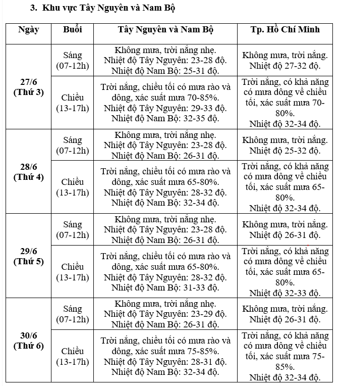 Dưới đây là dự báo chi tiết các vùng trên cả nước các ngày 27-30/6: