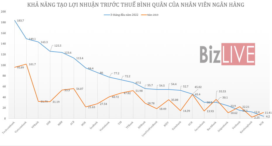 Những tính toán trên được lấy dữ liệu trong báo cáo tài chính hợp nhất năm 2019 và báo cáo tài chính hợp nhất quý 1/2022 của các ngân hàng, với số lượng nhân viên được tính là số chốt cuối kỳ trong khi số nhân viên thực tế trong kỳ của ngân hàng có thể biến động.