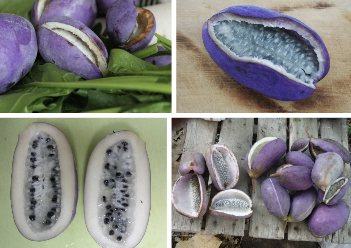 Cụ thể, lúc quả còn ở trên cây thì nó trông giống trái xoài có vỏ màu tím. Khi lấy dao xẻ ra, bên trong lại giống như ruột của quả chuối. Bất ngờ hơn, lúc cắt thành từng miếng còn thấy có rất nhiều hạt màu đen.
