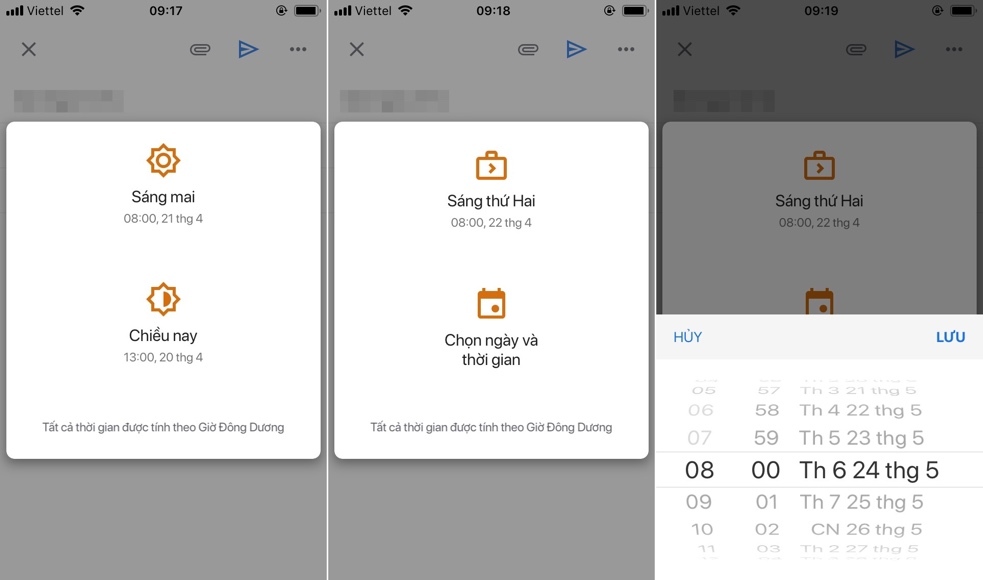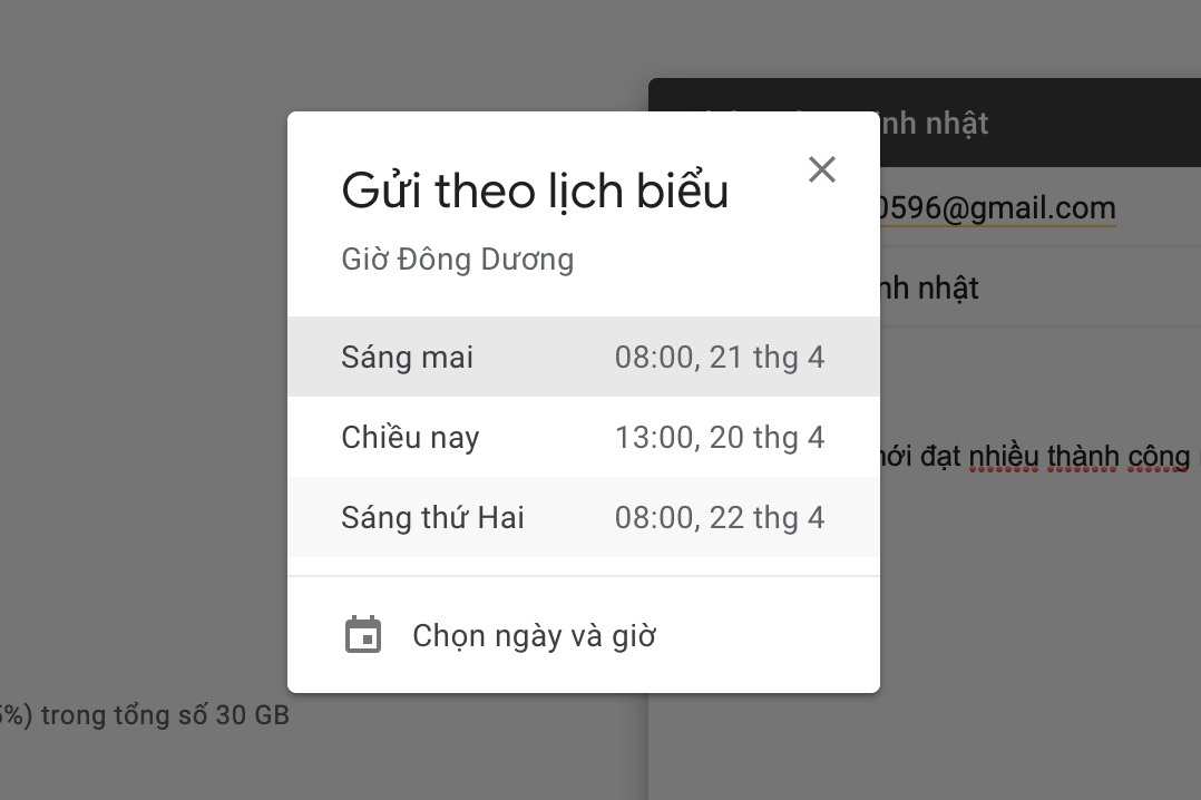 Sau đó, tương tự như trên ứng dụng di động, bạn có thể chọn các khoảng thời gian mặc định do Gmail cung cấp sẵn, hoặc lên lịch theo ý bạn muốn.