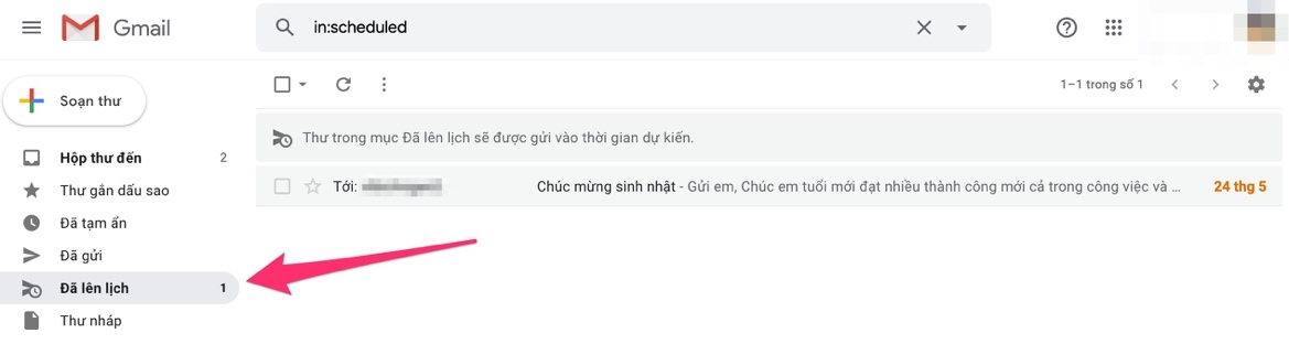 Nếu muốn xem lại các email đã lên lịch gửi đi, bạn cũng chọn thẻ Scheduled (Đã lên lịch) từ trình đơn bên trái.