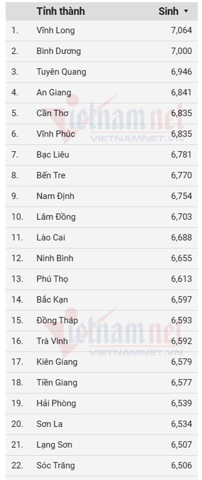 Theo thống kê này, thí sinh Vĩnh Long đạt trung bình 7,064 điểm ở môn Sinh học, cao nhất cả nước.