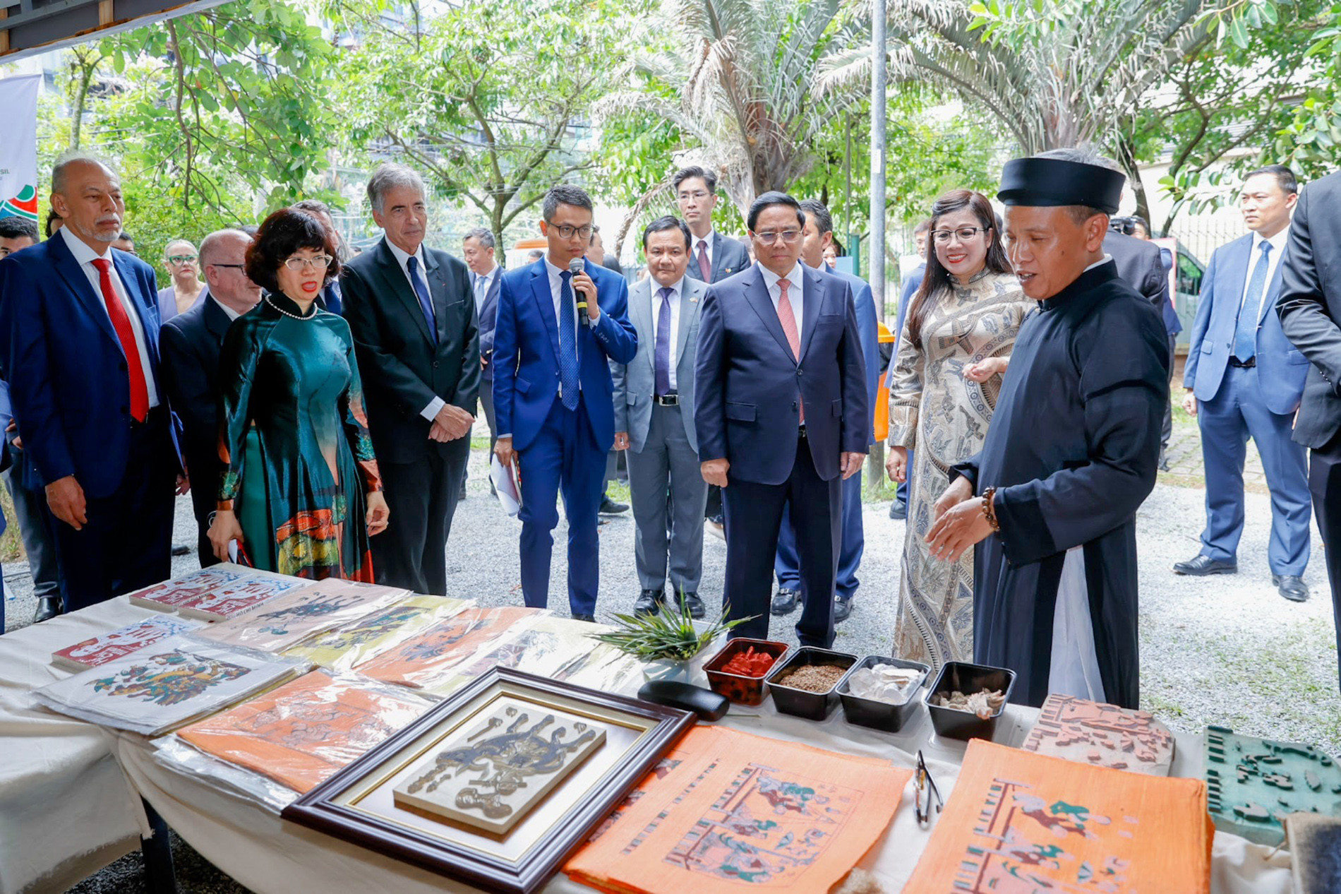 Sau màn chào đón mang đậm chất Việt Nam, Thủ tướng cùng Phu nhân và đoàn đại biểu Việt Nam tham quan các gian hàng trưng bày các sản phẩm văn hóa của Việt Nam như tranh Đông Hồ, tò he, múa rối nước,…