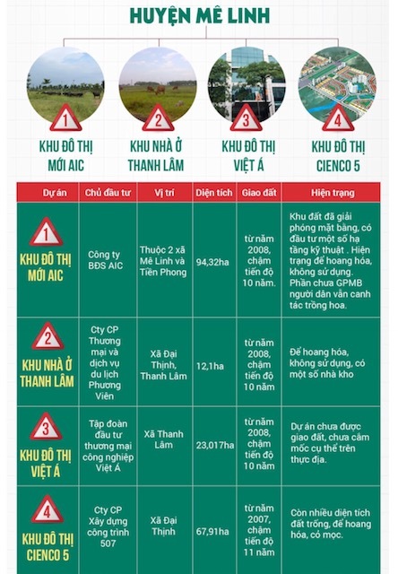 Tại huyện Mê Linh, xã Tiền Phong nơi tập trung nhiều dự án nhất với gần 20 dự án nhà ở, khu đô thị quy mô hàng trăm hec-ta như: Khu nhà nghỉ và biệt thự Nam Sơn của Cty CP Vinh Sơn trên 60ha; Khu biệt thự sinh thái Phúc Việt của Cty CP ĐTXD&TM Phúc Việt quy mô 24,3 ha; Khu chung cư cao tầng và nhà ở cho công nhân KCN của Cty CP ĐT-XD số 18 quy mô gần 16 ha; KĐT Minh Giang Đầm Và (2 giai đoạn) của Cty TNHH Minh Giang gần 22ha; dự án làng hoa Tiền Phong của Cty TNHH Tiền Phong trên 40ha; Làng Quốc tế Tiền Phong gần 30ha.., đều trong tình trạng đắp chiếu, cỏ mọc um tùm.