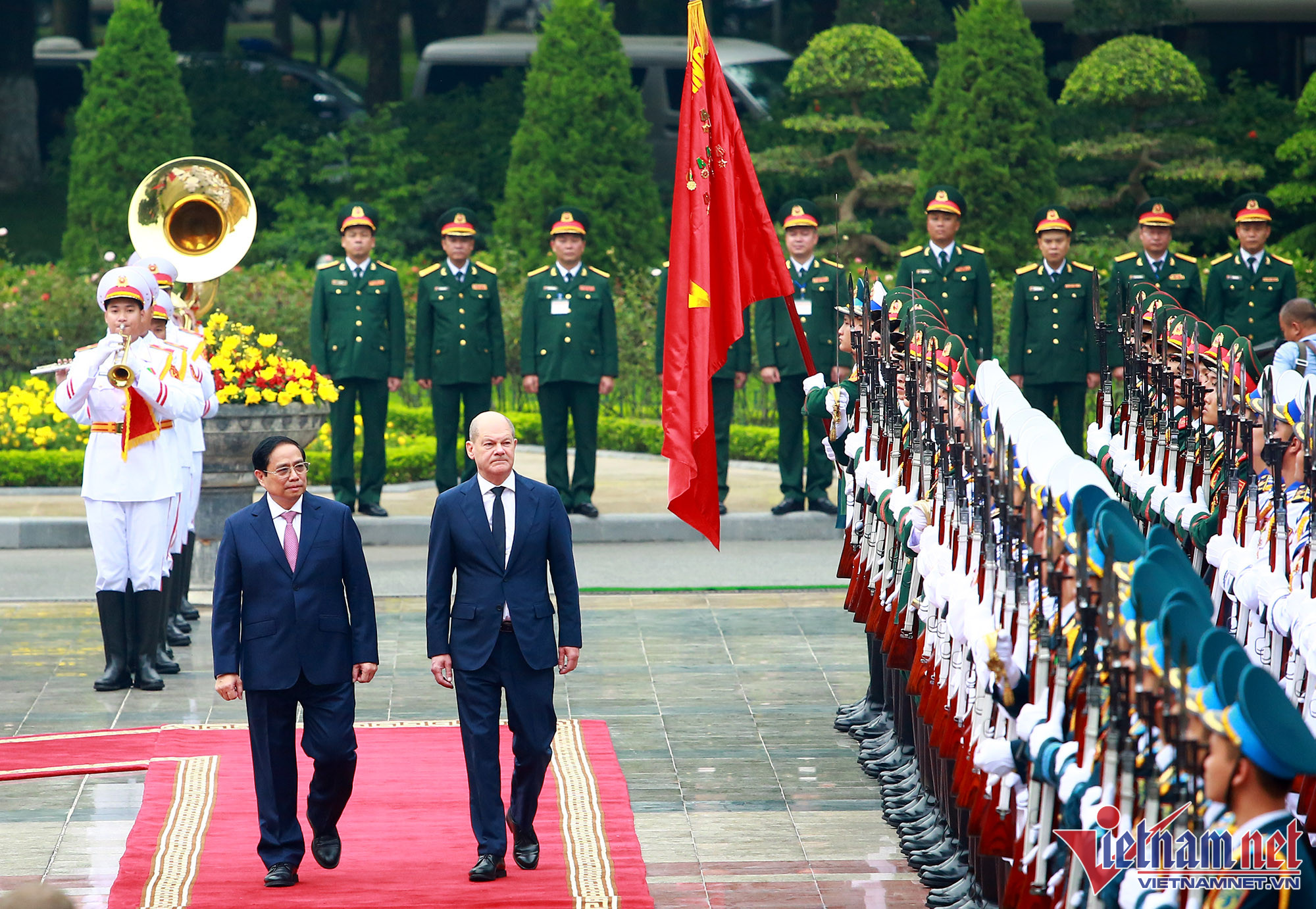 Khi hai Thủ tướng bước lên bục danh dự, dưới quốc kỳ hai nước, Quốc thiều hai nước đã được cử lên trang nghiêm. Thủ tướng Phạm Minh Chính mời Thủ tướng Đức duyệt Đội danh dự Quân đội nhân dân Việt Nam; sau đó hai nhà lãnh đạo giới thiệu thành phần đoàn hai bên tham dự lễ đón.