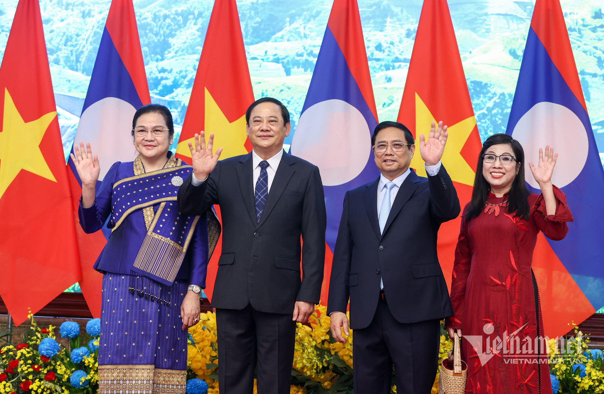 Khi đoàn xe đưa Thủ tướng Lào Sonexay Siphandone và phu nhân tới Phủ Chủ tịch, Thủ tướng Phạm Minh Chính và phu nhân đã ra tận cửa xe đón.